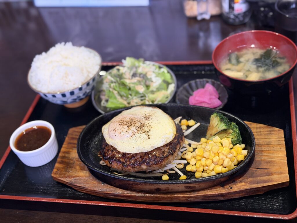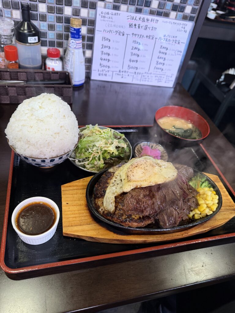 我々はハンバーグ定食とハーフ&ハーフ定食を注文😃